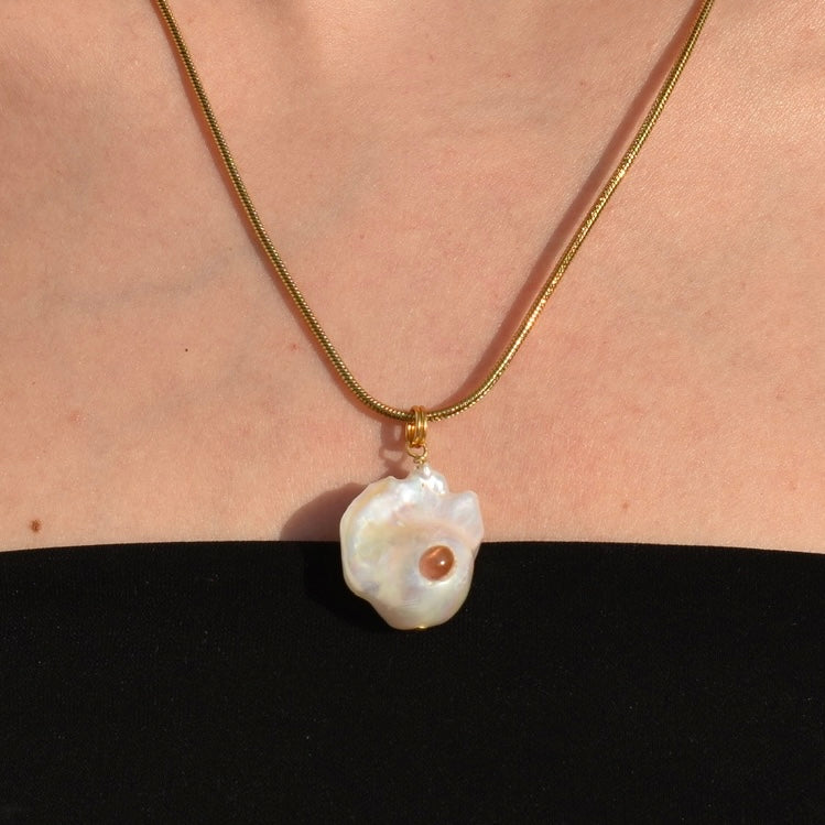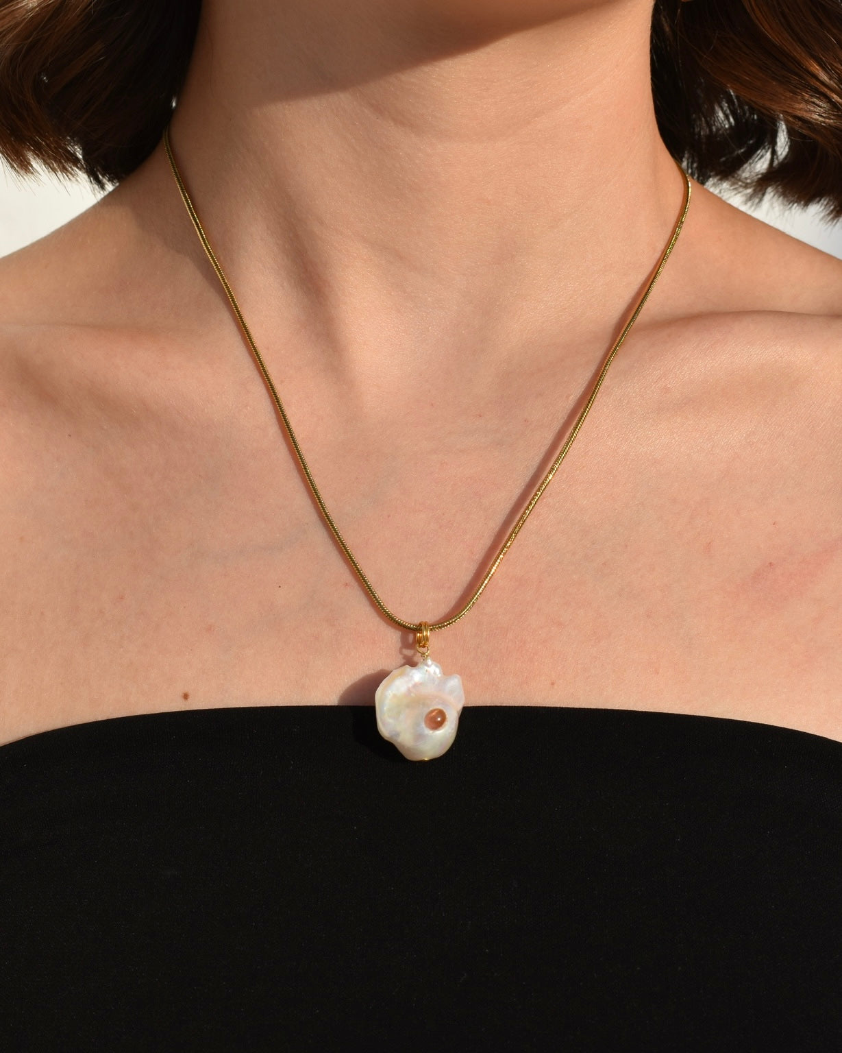 Ambas se unen en una composición equilibrada, suspendida de una cadena de acero inoxidable que combina elegancia con resistencia, creando un contraste sutil entre la delicadeza y la fuerza.