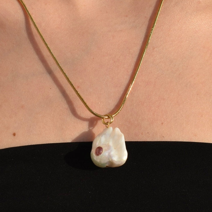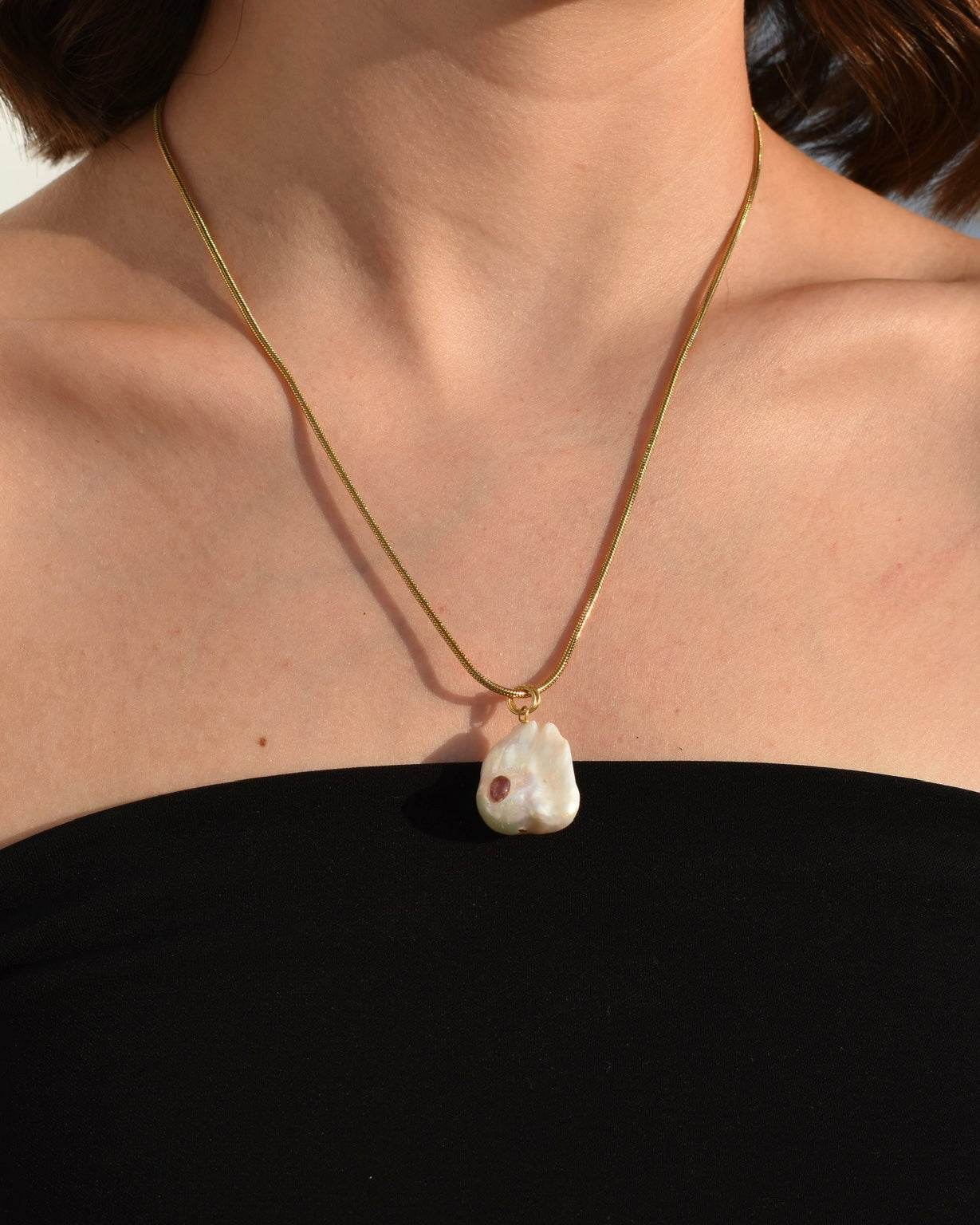 Ambas se unen en una composición equilibrada, suspendida de una cadena de acero inoxidable que combina elegancia con resistencia, creando un contraste sutil entre la delicadeza y la fuerza.