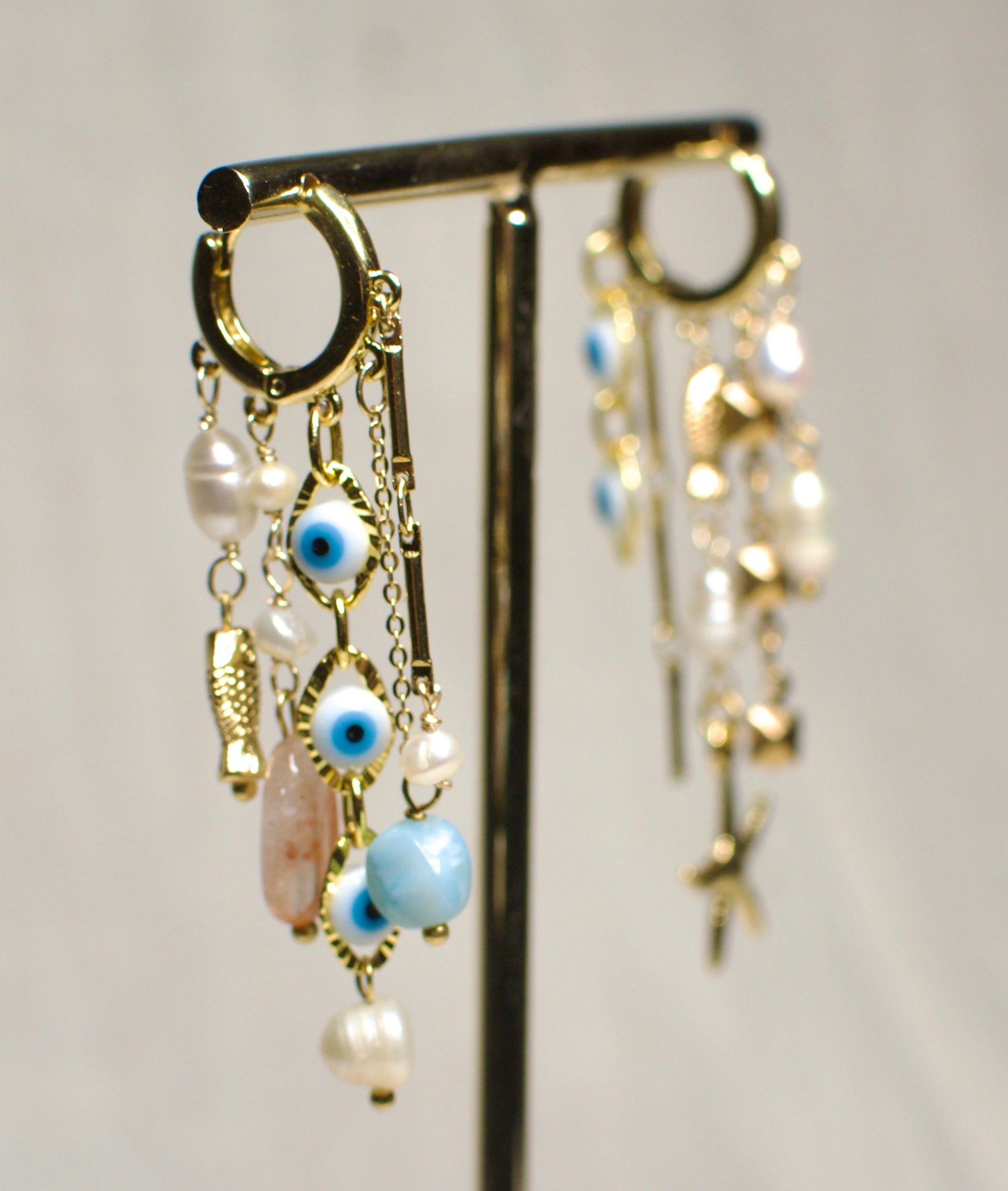 Aretes de chapa de oro compuestos de dijes de perlas de rio, piedras naturales, y dijes de chapa de oro, hechos completamente a mano.
