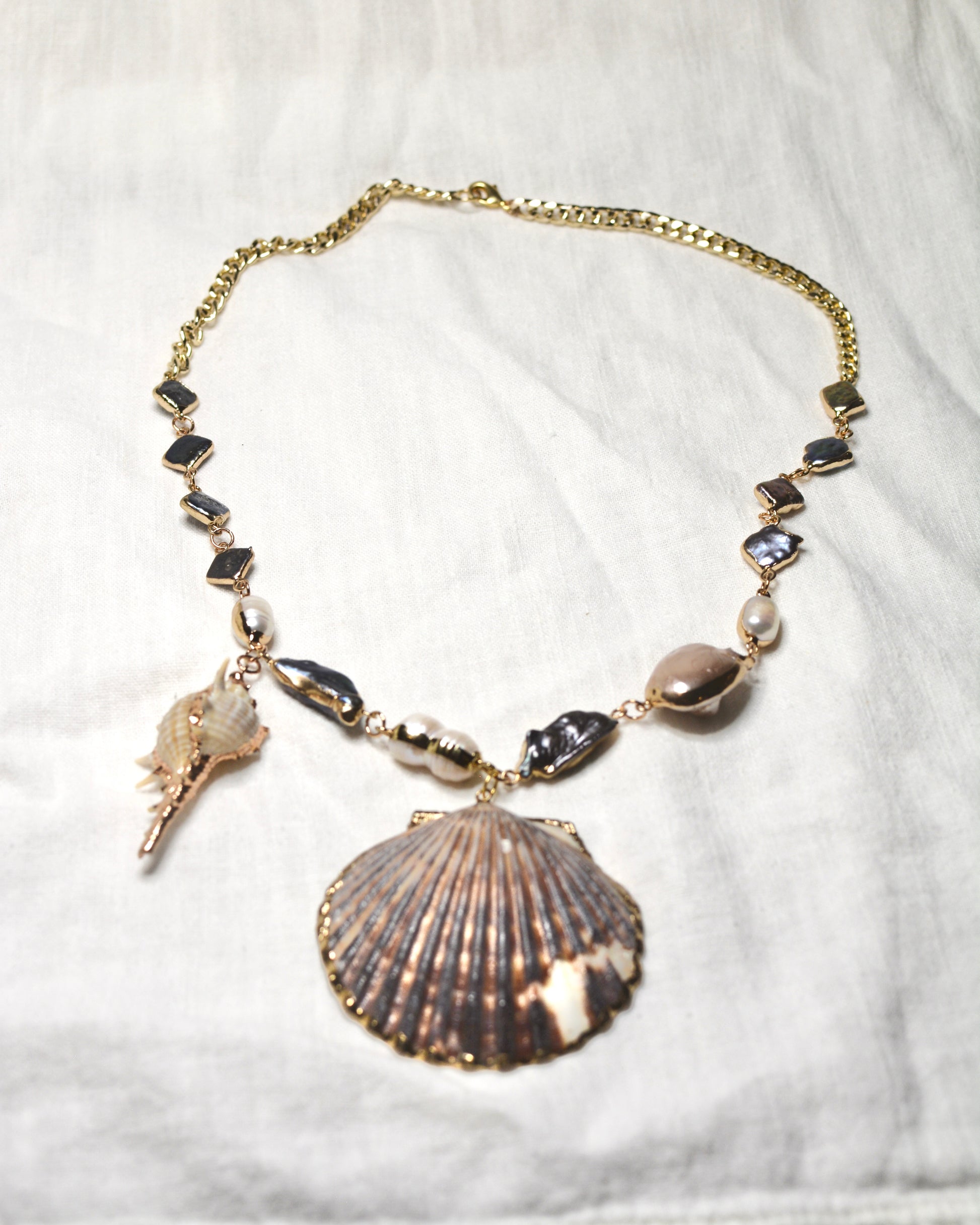 Pieza única hecha a mano de oro laminado con perlas naturales y conchas naturales.