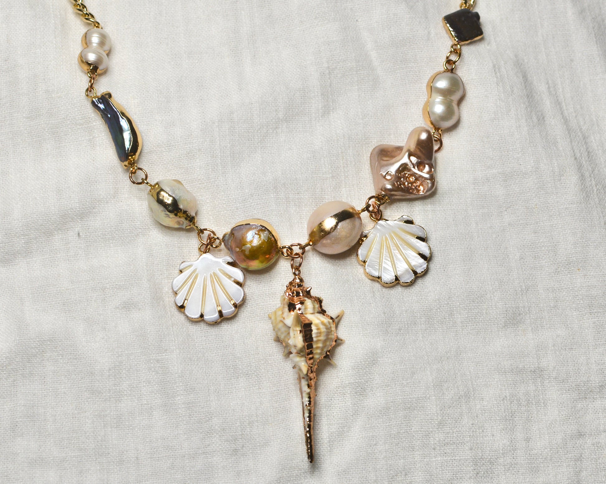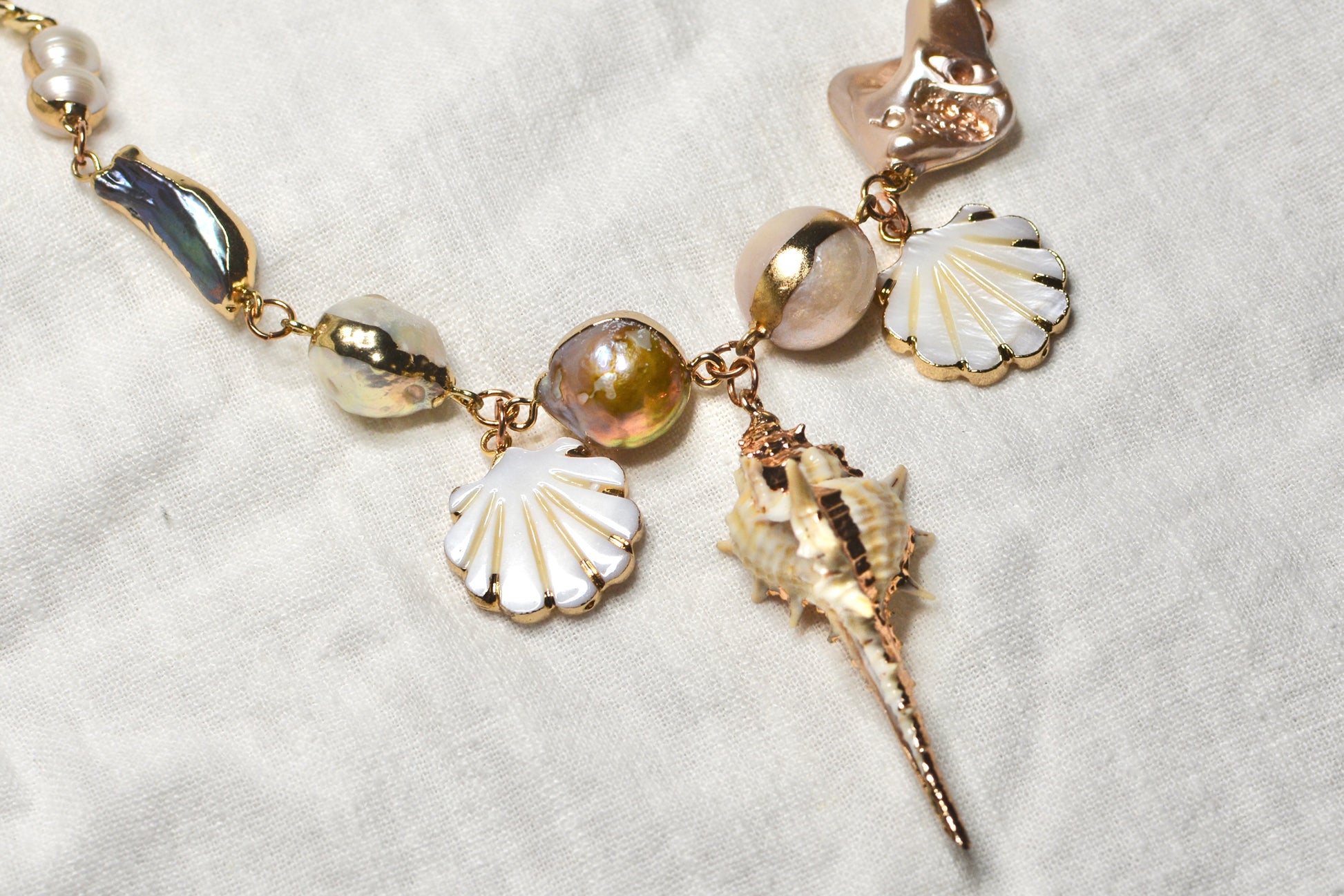 Pieza única hecha a mano de oro laminado con perlas naturales y conchas naturales.