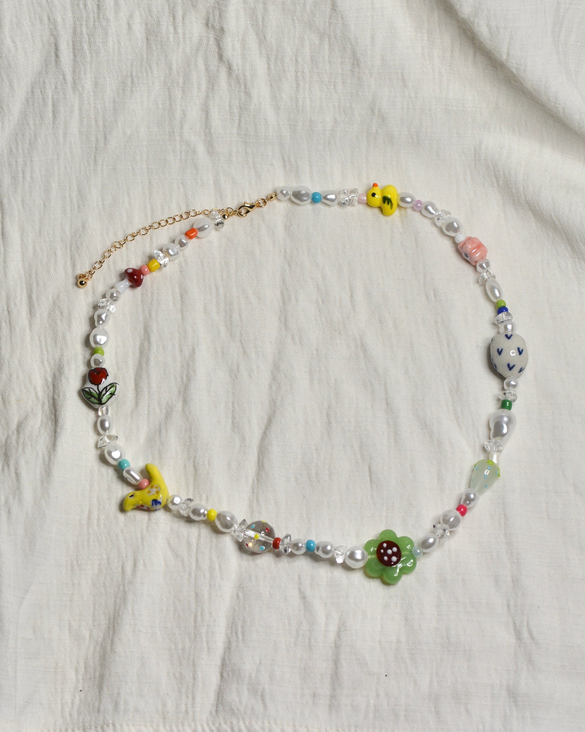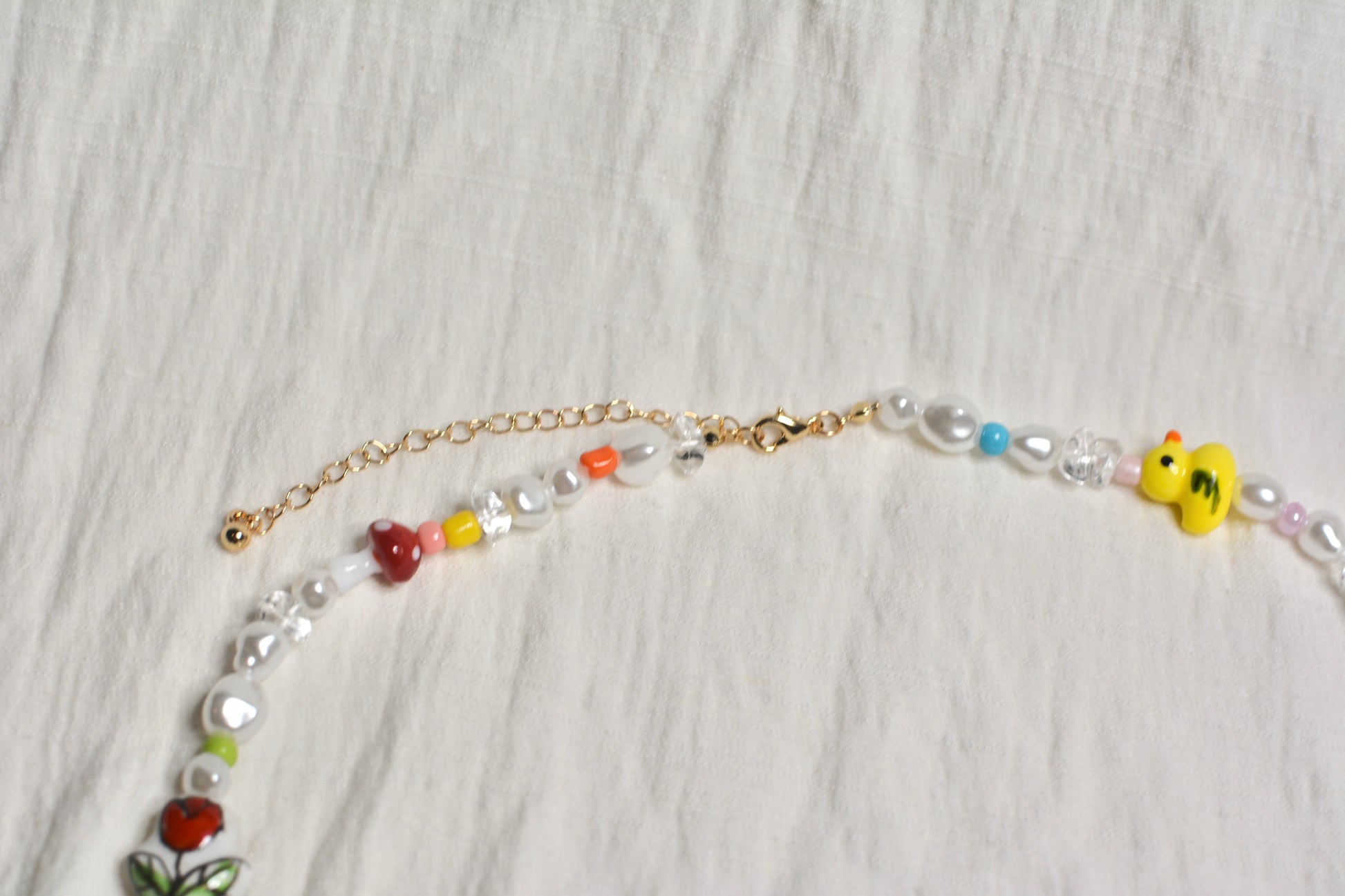 Collar hecho a mano con perlas naturales y dijes de vidrio soplado.