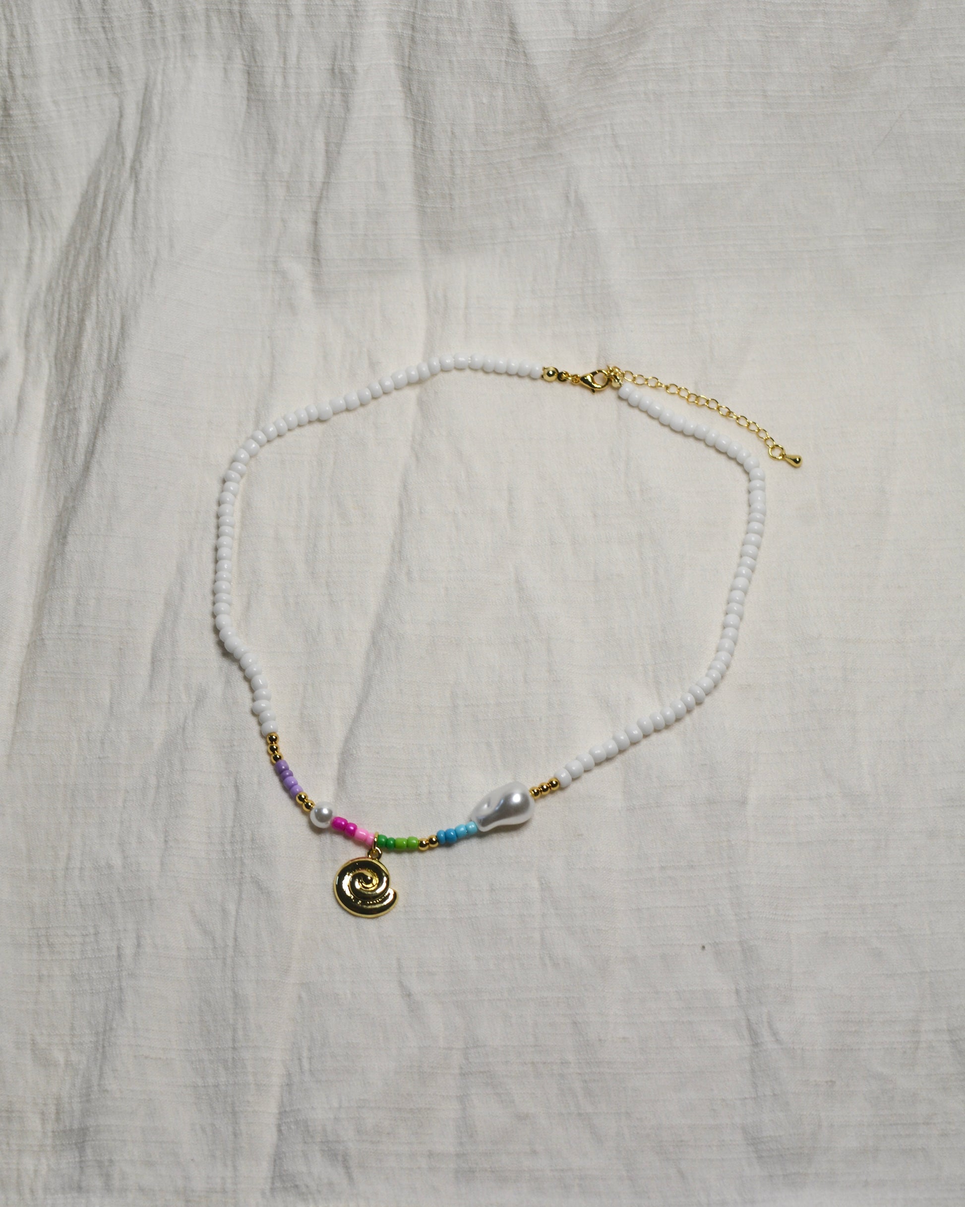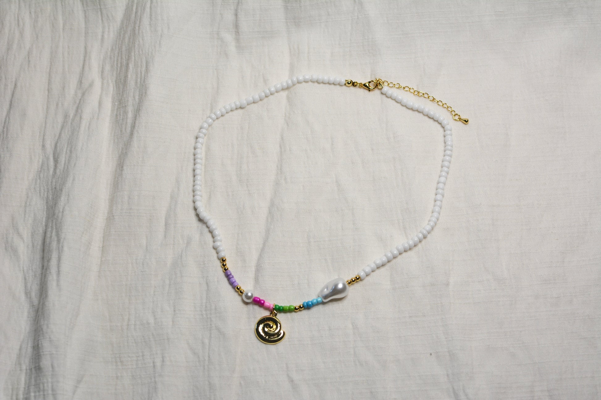 Collar de acero inoxidable con chaquiras blancas con perla artificial.