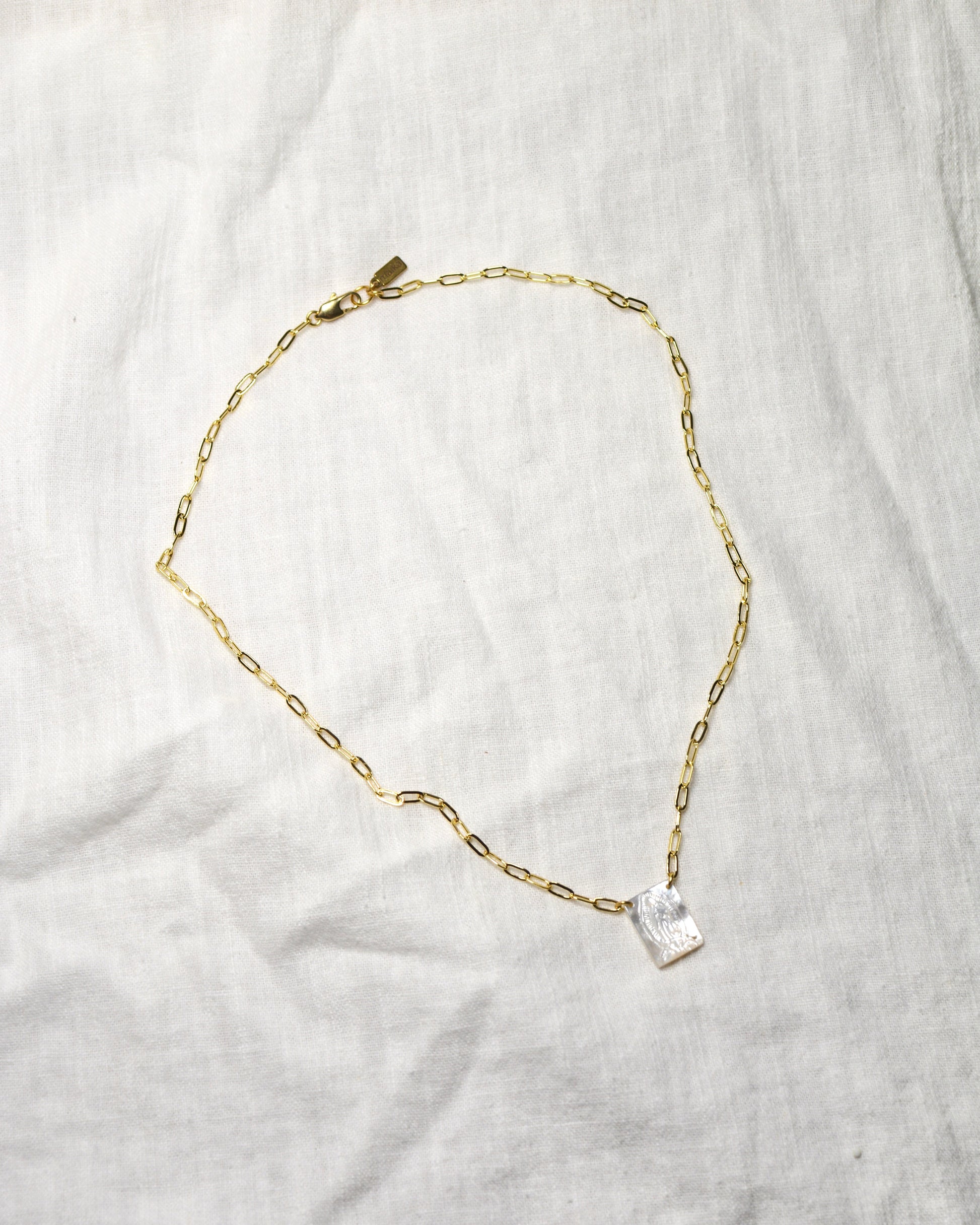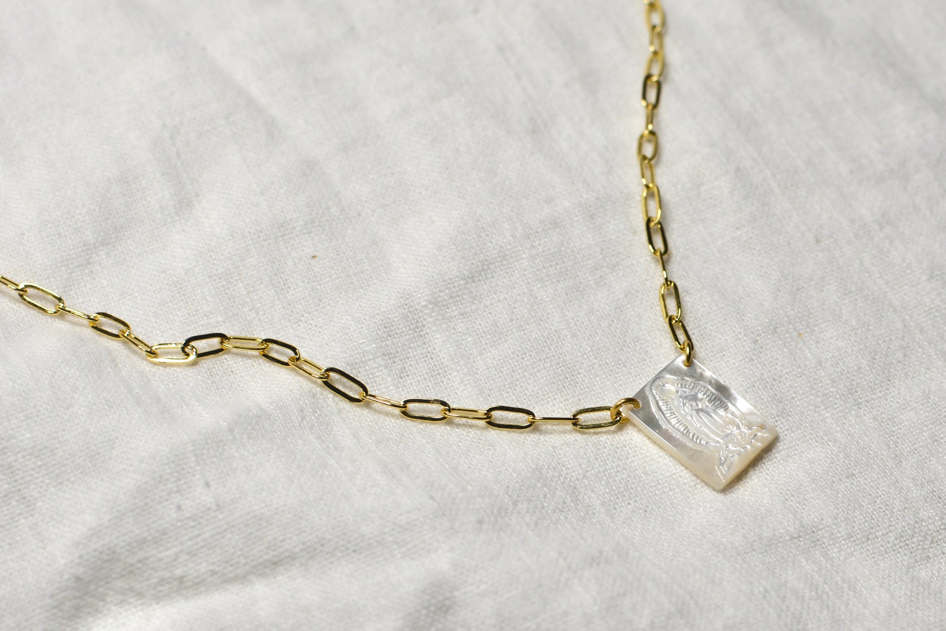Collar de chapa de oro con dijes de la virgen Maria en perla madre.