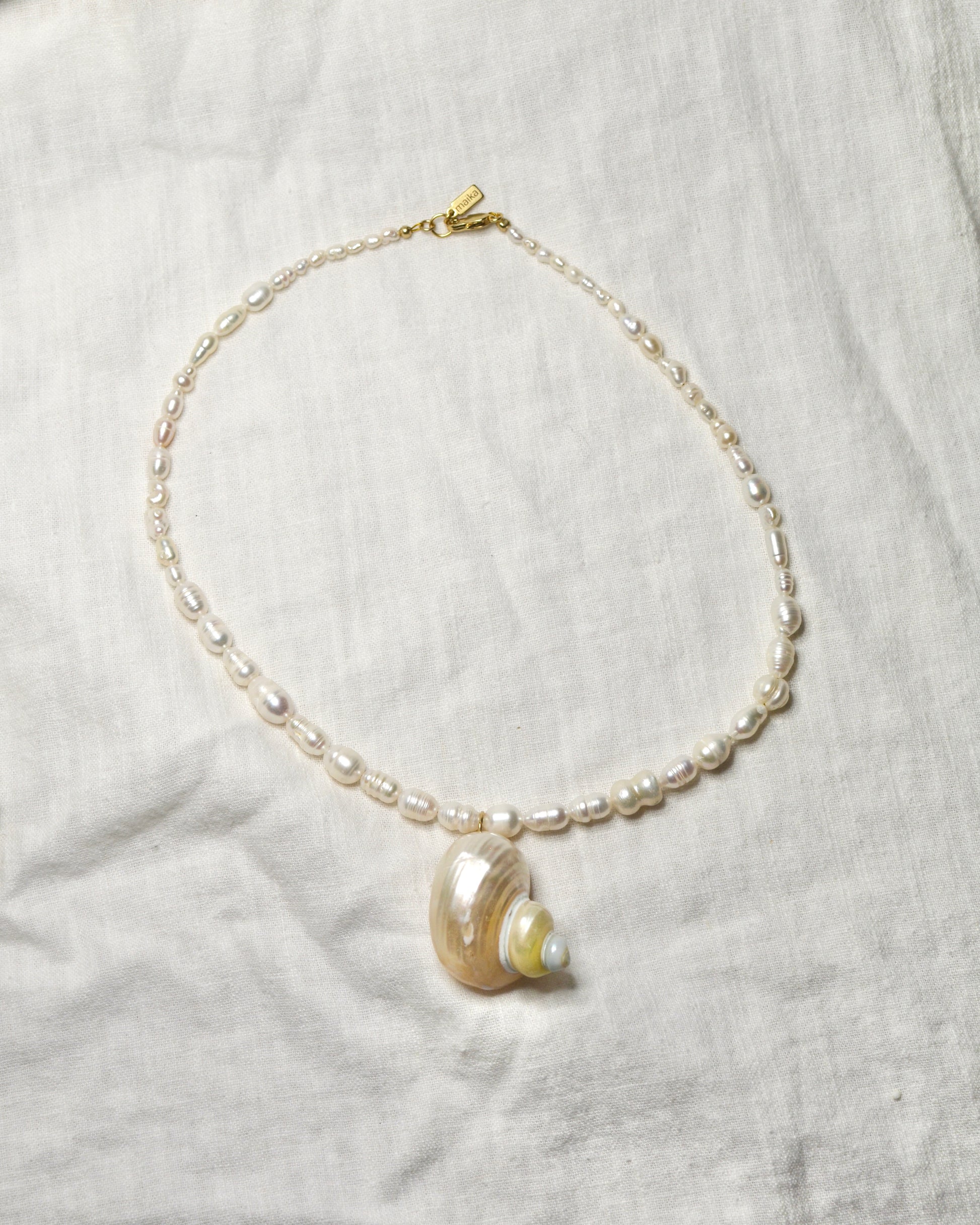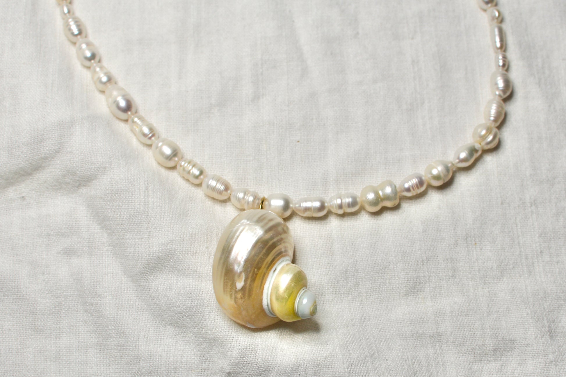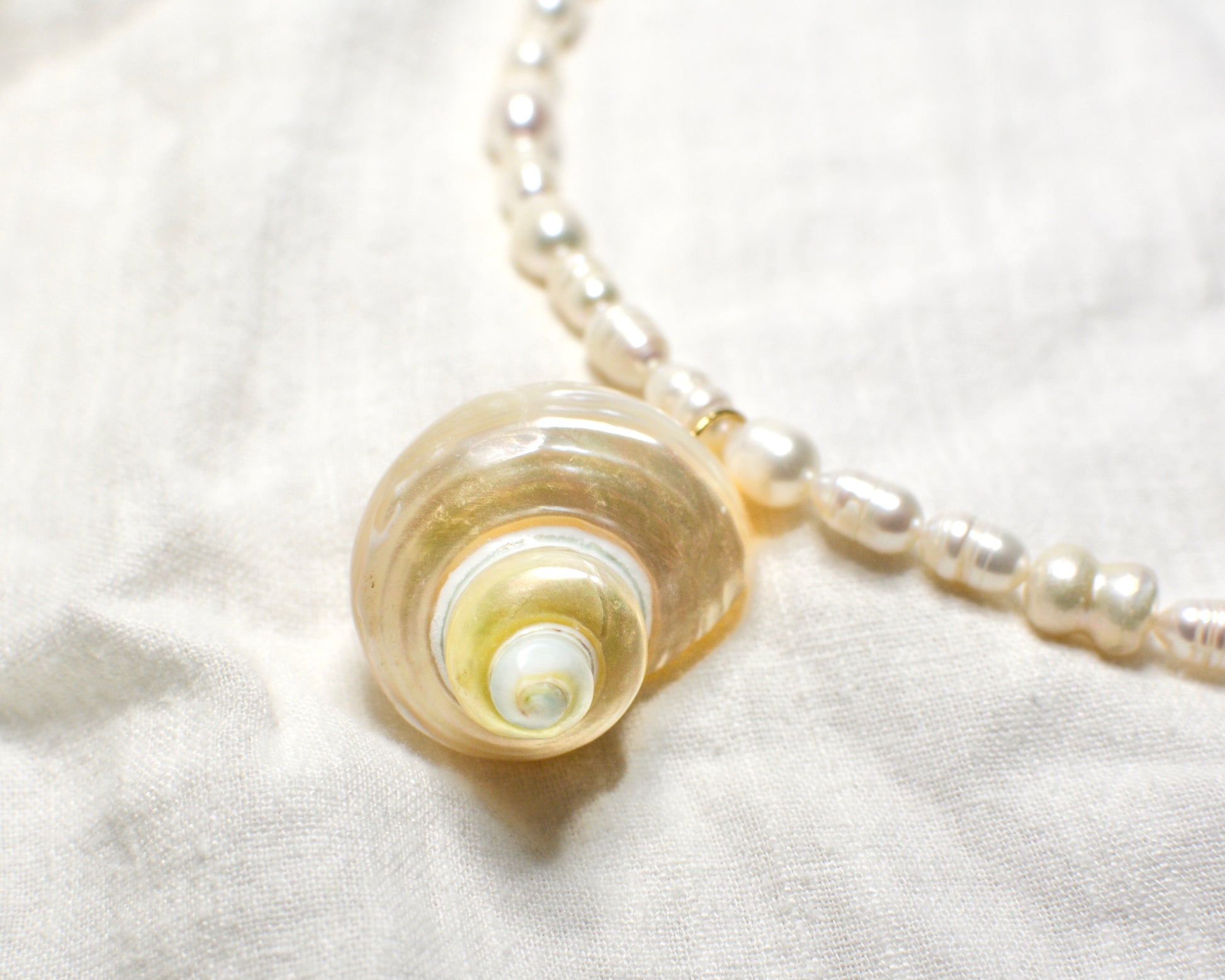 Collar hecho a mano con pelas naturales y dijes de caracol natural.