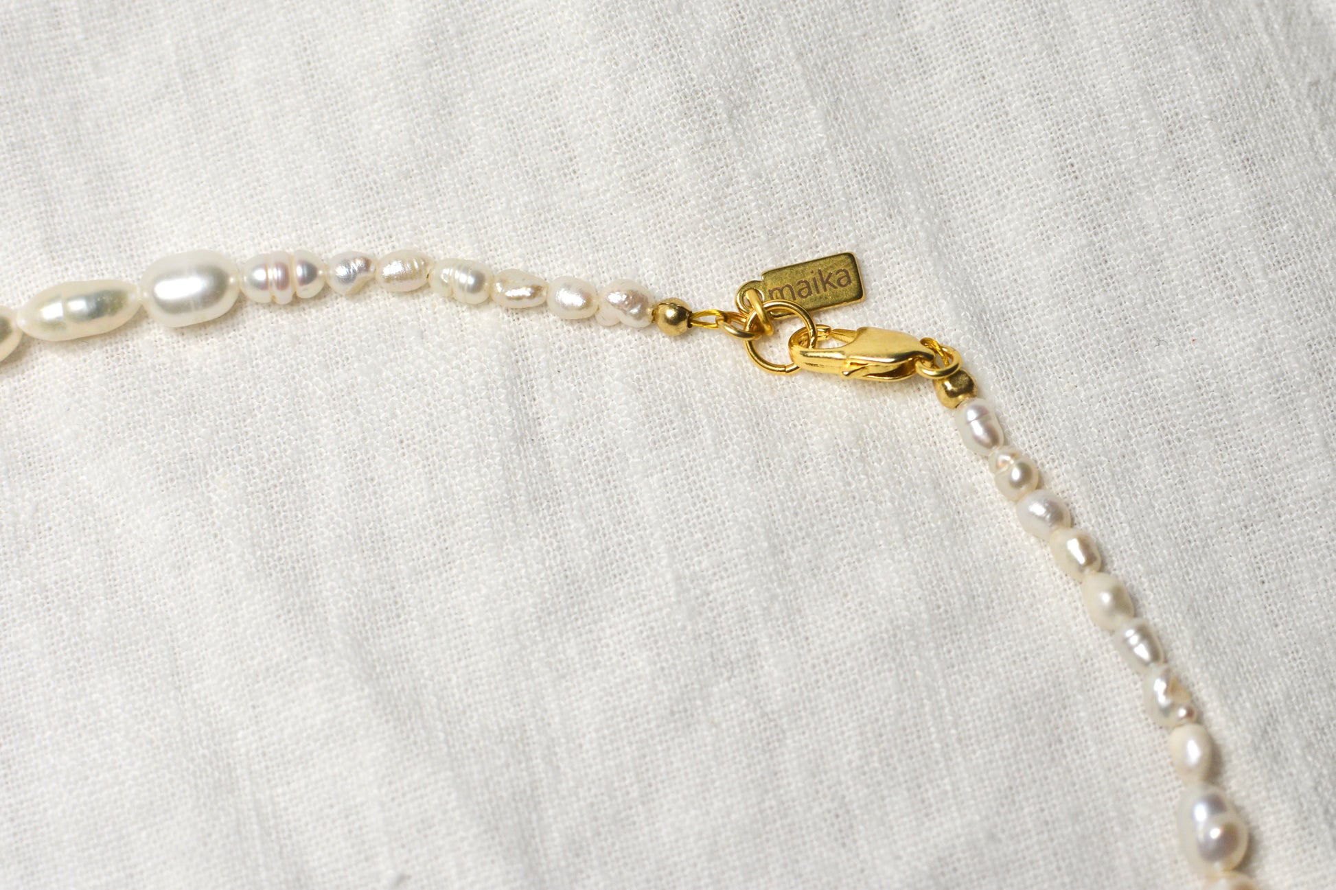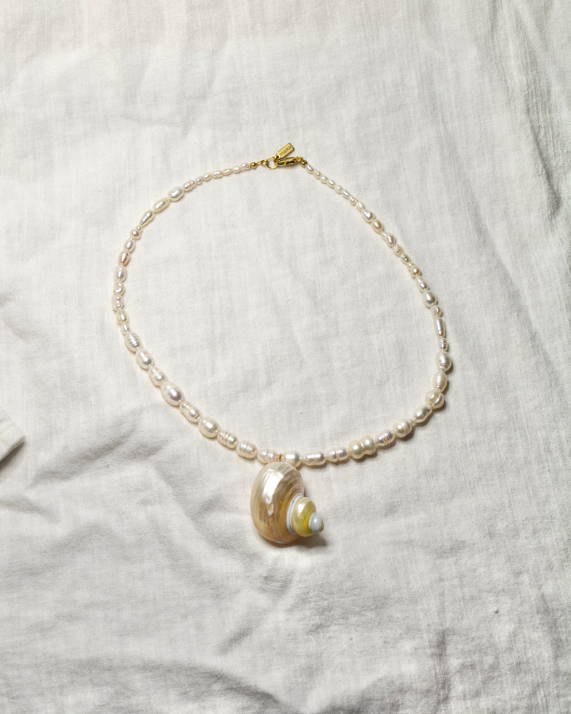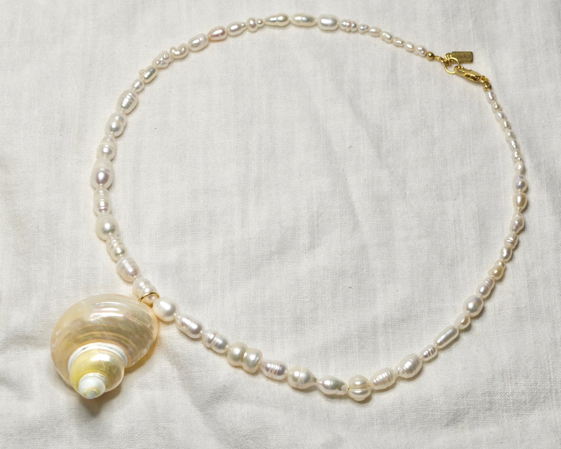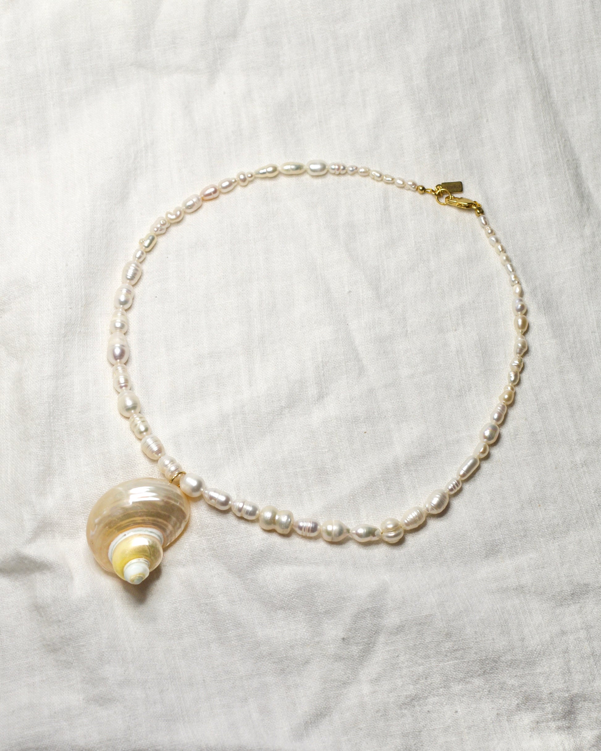 Collar hecho a mano con pelas naturales y dijes de caracol natural.