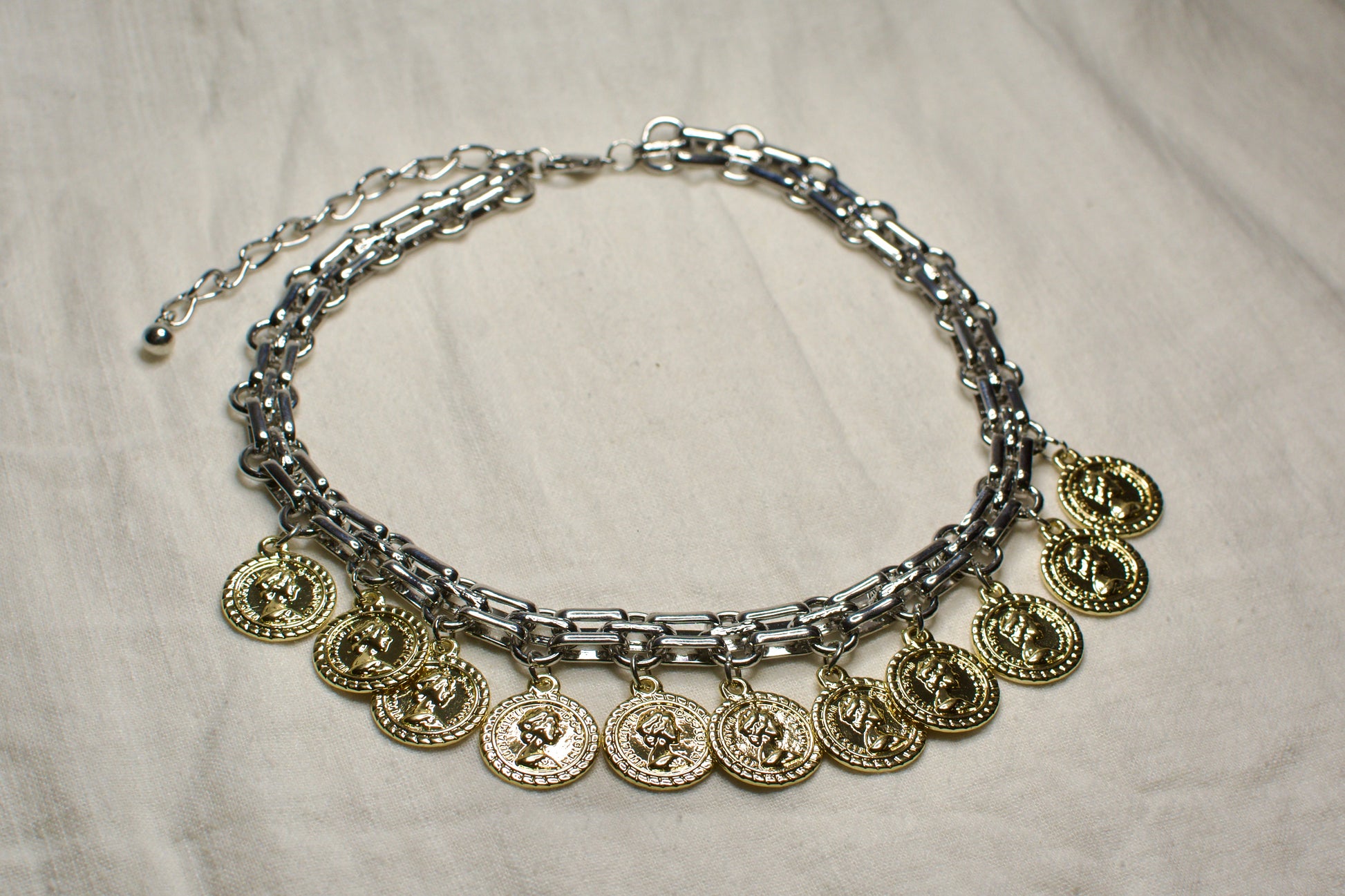 Collar de hacer inoxidable con cadena plateada y dijes dorados.