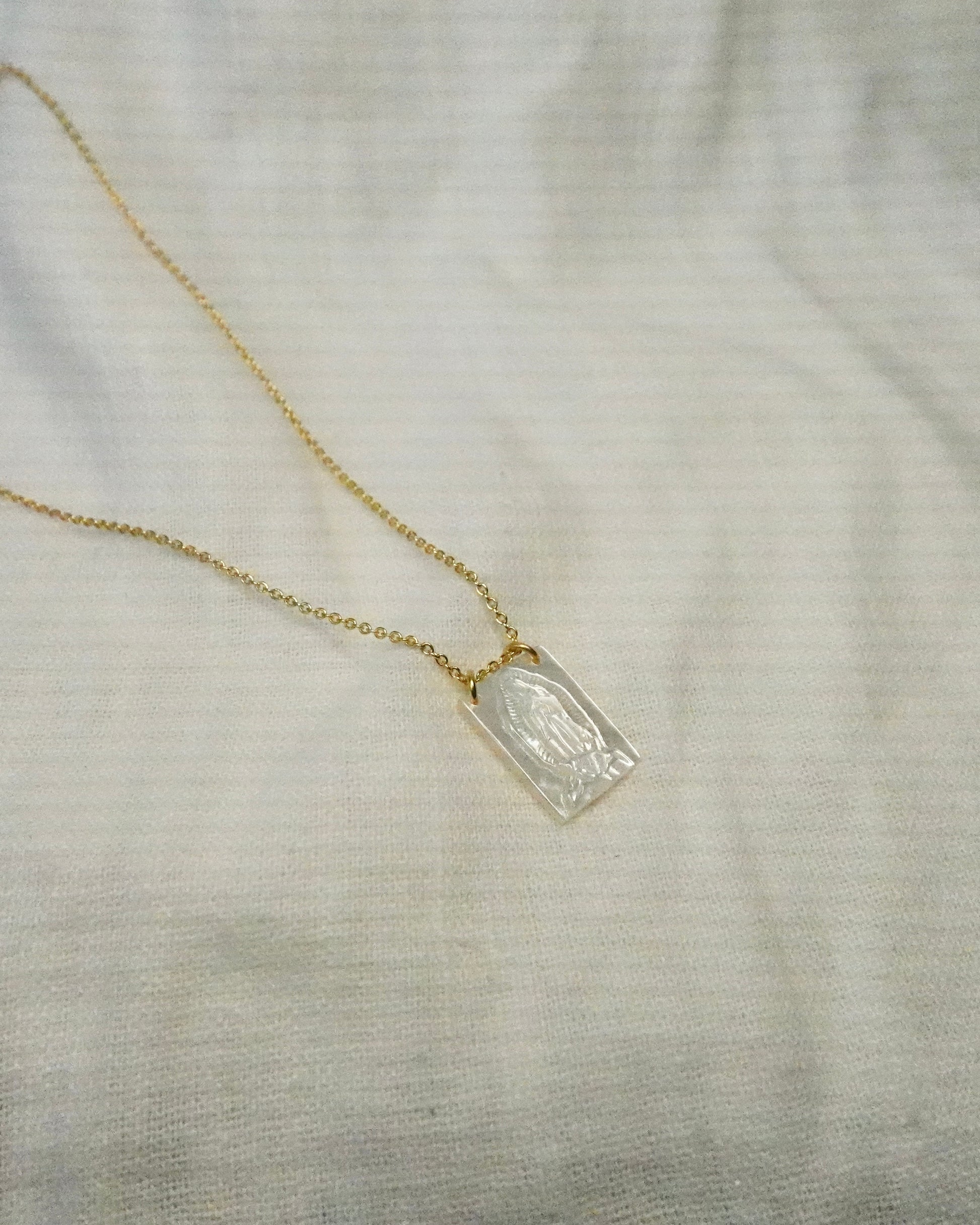 Collar hecho a mano de dije de concha nácar de la virgen.