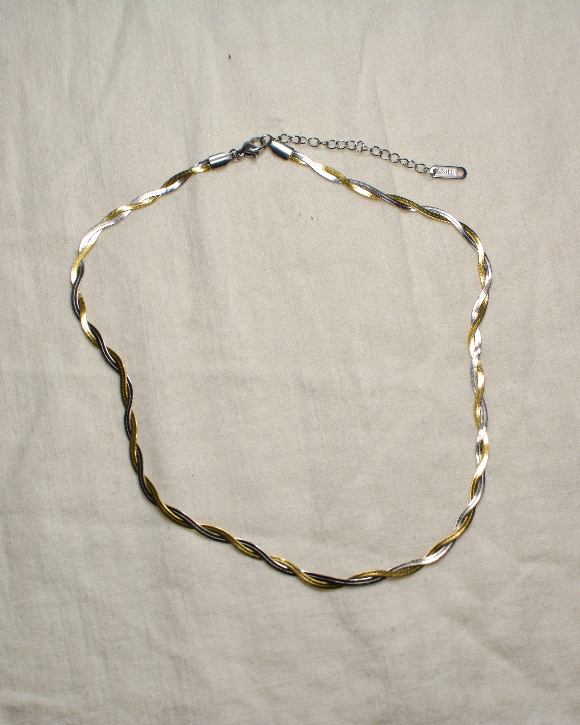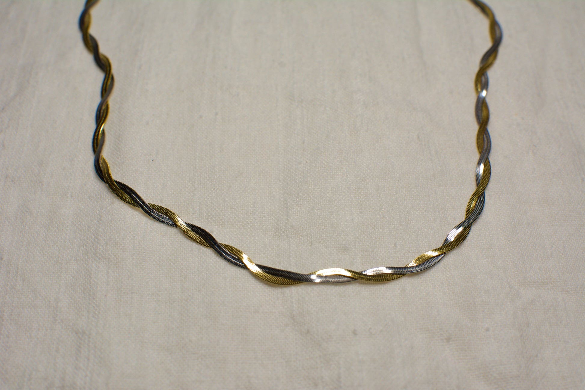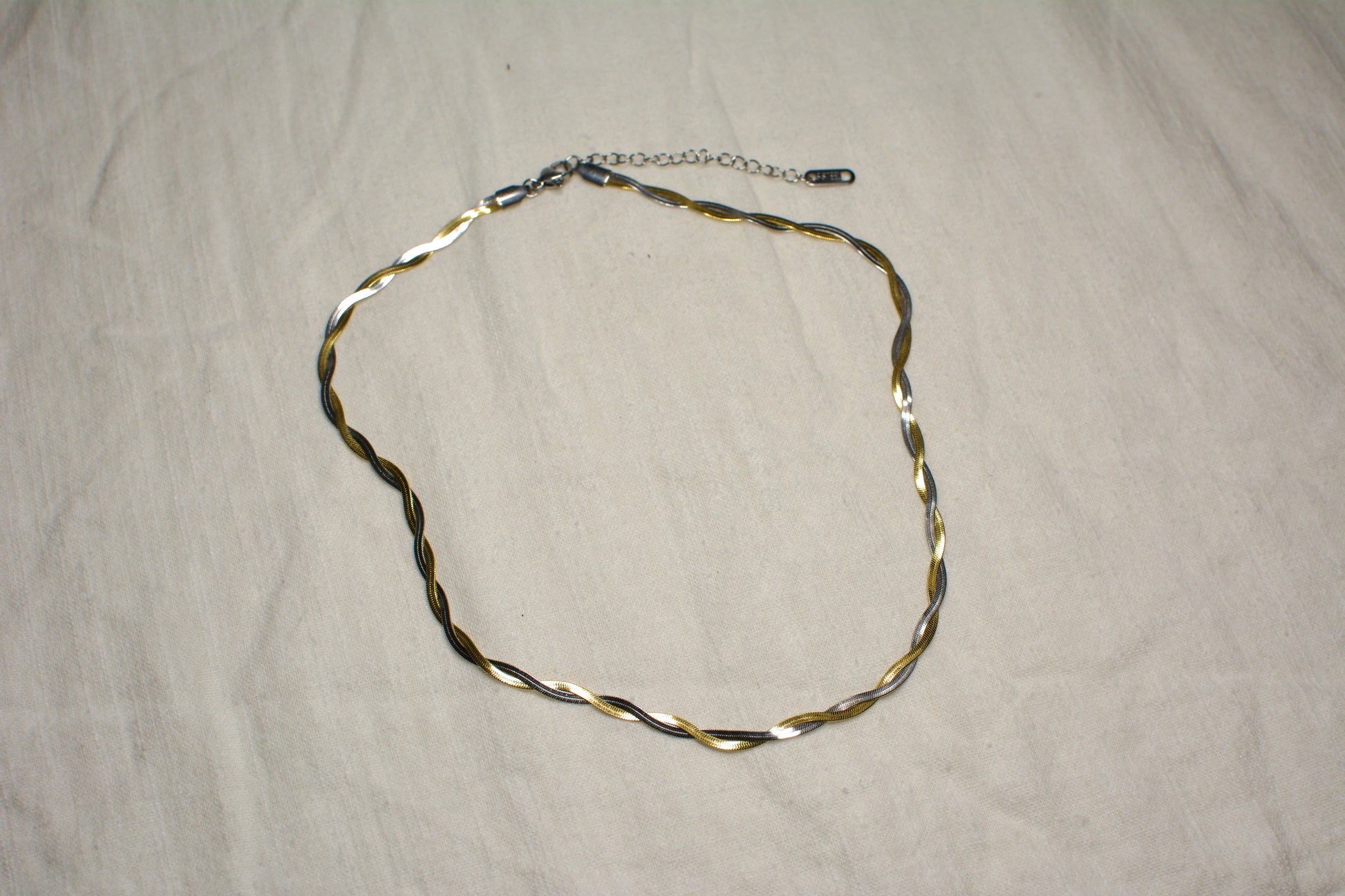 Cadena prensada de acero inoxidable dorada y plateada entrelazada.